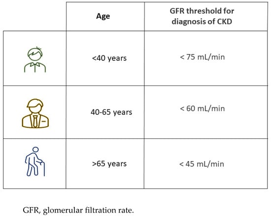 Epidemiological studies have also reported that patients aged more than 65 years have a considerably higher risk of CKD progression only when the GFR is less than 45 mL/min. In support of the thesis, the “Renal Risk in Derby” study, conducted on 1741 people with a mean age of 72.9 ± 9 years and with an average GFR of 54 ± 12 mL/min/1.73 m2, confirmed that patients with stage IIIa of CKD have a mortality risk lower than CKD stage IIIb and IV and more importantly, these patients had a similar survival rate than the general population [29]. Based on these data, Delanaye et al. [30] proposed a CKD staging stratified according to three age categories: <40, 40–65 and >65 years. A GFR threshold of 75 mL/min should be considered “normal” for patients aged less than 40 years, 60 mL/min for individuals aged 40–65 years and 45 mL/min for the oldest (Figure 2).