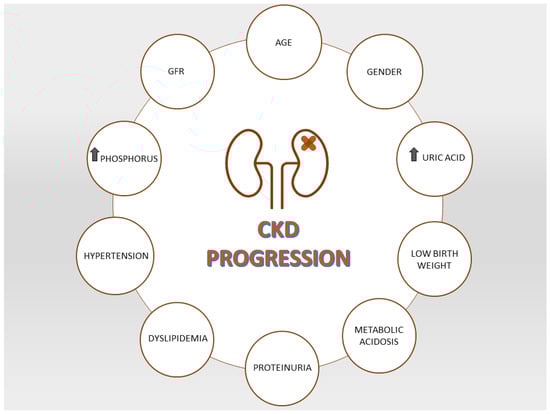 A study based on the registry of “Prevention of Progressive Renal Insufficiency Project of Emilia-Romagna region (Italy)” conducted in a large cohort of patients with a mean age of (71.2 ± 12.9 years) and a mean GFR of 28.8 mL/min, regularly followed by nephrologists, documented that proteinuria, young age, diabetes and hyperphosphatemia are the leading risk factors for progression of CKD toward ESKD. It is interesting to note that late-stage CKD and advanced age are not strictly associated with a rapid progression of chronic kidney disease. Old patients, especially women, tend to have a slower progression compared to the young ones, who have a severe prognosis of the underlying kidney disease [57].