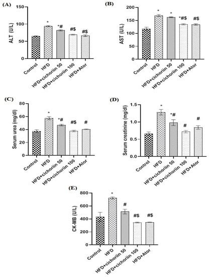 Effect of cichoriin on serum biochemical parameters of obese rats. ALT (A), AST (B), urea (C), creatinine (D), and CK-MB (E). Data are presented as means ± SEM (n = 5). *, #, and $ indicate significant difference from the (control), (HFD), and (HFD + cichorin 50 mg/kg) groups, respectively, at (p < 0.05). High-fat diet (HFD); atorvastatin (Ator); alanine transaminase (ALT); aspartate transaminase (AST); creatine kinase MB (CK-MB).