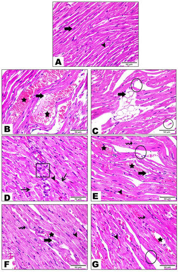 Photomicrograph sections of the control and HFD heart tissue of rats with or without treatments. Group I (control) (A) showed elongated, branched, and cross-striated cardiomyocytes with large oval central nuclei (thick arrow) and narrow slit-like interstices (arrowhead), group II (HFD) (B–D) showed vascular congestion (star), hemorrhage (arrowhead), excessive lipid deposition (thick arrow), distinct interstitial edema (circle), marked inflammatory cell infiltration (cube) and vacuolar degeneration of the cardiomyocytes (thin arrow), group III (HFD + 50 mg/kg of cichoriin) (E) showed normal cardiomyocytes (wave arrow), moderate vascular congestion (star), hemorrhage (arrowhead), few lipids deposition (thick arrow) and interstitial edema (circle), group IV (HFD + 100 mg/kg of cichoriin) (F) showed normal cardiac myocytes (wave arrow), mild congestion (star), hemorrhage (arrowhead) and less lipid deposition (thick arrow) and group V (10 mg/kg of atorvastatin) (G) showed mild to moderate vascular congestion (star), hemorrhage (arrowhead), normal cardiomyocytes (wave arrow) and interstitial edema (circle). High-fat diet (HFD). Scale bar, 50 μm.