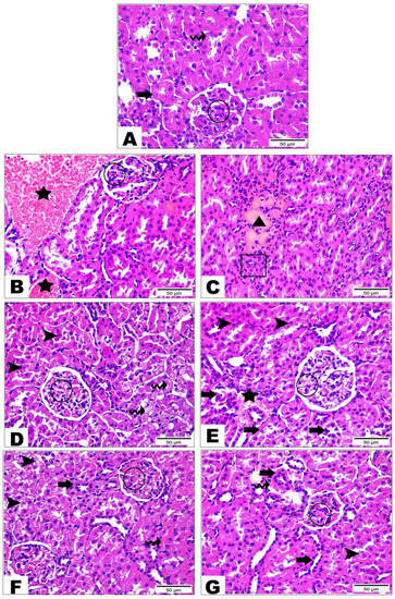 Photomicrograph sections of the control and HFD kidney tissue of rats with or without treatments. Group I (control) (A) showed the renal corpuscle (circle) and proximal (thick arrow) and distal (wave arrow) convoluted tubules, group II (HFD) (B–D) showed severe vascular congestion (black star), congestion of the renal corpuscle (circle), severe interstitial hemorrhage (triangle), inflammatory cells infiltration (thick arrow), degeneration with the desquamation of the epithelial lining (arrowheads) and cytoplasmic vacuolization with the pyknotic nuclei of the lining epithelium (wave arrow), group III (HFD + 50 mg/kg of cichoriin) (E) showed renal corpuscle with mild congestion (circle), renal tubules with an intact lining epithelium (arrowheads), mild vascular congestion (star) and a few renal tubules showing desquamated epithelial cells with pyknotic nuclei (thick arrows), group IV (HFD + 100 mg/kg of cichoriin) (F) and group V (10 mg/kg of atorvastatin) (G) showed tubular degeneration (arrowhead), pyknosis of the lining epithelium (thick arrow), mild hemorrhage interstitial between the renal tubules (wave arrow) and congestion inside the renal corpuscle (circle). High-fat diet (HFD). Scale bar, 50 μm.