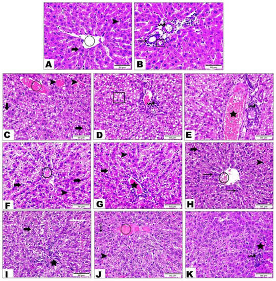 The control group (Figure 4A,B) showed the normal architecture of the central vein (the circle), blood sinusoids (the arrowhead), and hepatic cords containing large hepatocytes (the thick arrow) with central, spherical, and vesicular nuclei. The portal triad displayed a normal portal vein (the wave arrow), hepatic artery (the cube), and bile canaliculi (the thin arrow) (Figure 2B). The HFD group (Figure 4C–E) exhibited severe hepatic injury, including severe congestion of the central vein (the circle) and blood sinusoids (the arrowhead), hepatocellular degeneration (the arrow), micro-vesicular steatosis (the cube), inflammatory cells infiltration (the wave arrow), severe congestion, and dilatation of the portal vein (the star). The cichoriin-treated (50 mg/kg) group (Figure 4F,G) demonstrated a lesser hepatic injury than the positive control group, evidenced by the mild congestion of the central vein (the circle) and blood sinusoids (the arrowhead) and moderate hepatocellular degeneration with the cytoplasmic vacuolation and pyknotic nuclei (the arrow), as well as dilatation and congestion of the portal vein (the star). The cichoriin-treated (100 mg/kg) group (Figure 4H,I) revealed a marked improvement in the tissue architecture manifested by a normal central vein (the circle) and regular hepatic cords with nearly normal hepatocytes (the thin arrow) and portal area (Figure 4I). However, mild congestion of the blood sinusoids (the arrowhead) and portal vein (the star), in addition to mild hepatocellular degeneration (the thick arrow), were still noticed. The atorvastatin-treated group (Figure 4J,K) presented a remarkable recovery, evidenced by apparently normal hepatocytes (the thin arrow) with vesicular nuclei and prominent nucleoli, mild sinusoidal dilatation, and congestion (the arrowhead), whereas the central vein (the circle) showed severe congestion. The portal triad exhibited mild congestion of the portal vein (the star) with mild inflammatory cell infiltration (the wave arrow).