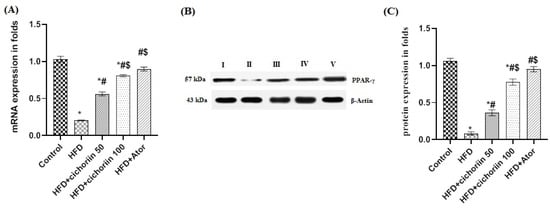 mRNA (A) and protein expressions (B,C) of PPAR-γ in adipose tissue of different groups. Data are presented as means ± SEM (n = 3). *, #, and $ indicate significant difference from the (control), (HFD), and (HFD + cichoriin 50 mg/kg) groups, respectively, at (p < 0.05). Group I (control); group II (HFD); group III (HFD + 50 mg/kg, cichoriin); group IV (HFD + 100 mg/kg, cichoriin); group V (10 mg/kg, atorvastatin); torvastatin (Ator); peroxisome proliferator-activated receptor gamma (PPAR-γ).