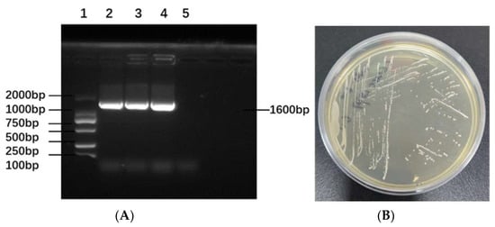Verification of Lacticaseibacillus casei CGMCC 1.8727. (A) PCR identification results. 1: DL2000 DNA Marker 2–4: Lacticaseibacillus casei CGMCC1.8727 5: negative control; (B) Colony morphology of Lacticaseibacillus casei CGMCC1.8727.