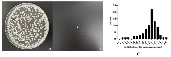 Figure 2A,B shows that the sizes of the microencapsulated Lacticaseibacillus casei CGMCC1.8727 were uniform and the shapes were close to spherical. Figure 2C shows that the average particle size of the microcapsules was 2.04 ± 0.2743 mm.
