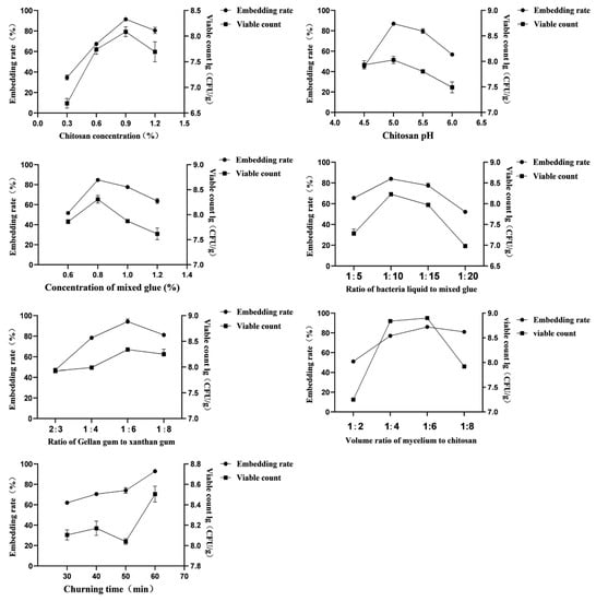It can be seen from Figure 3, when the concentration of chitosan was 0.9%, the pH 5.0 of chitosan, the concentration of mixed gel solution was 0.8%, the product ratio of bacterial suspension to mixed colloid was 1:10, the mass ratio of gellan gum to xanthan gum was 1:6, the volume ratio of mycolloid to chitosan solution was 1:6, and the stirring time was 60 min, the number of viable bacteria per unit mass and the embedding rate of the microcapsules were the highest.