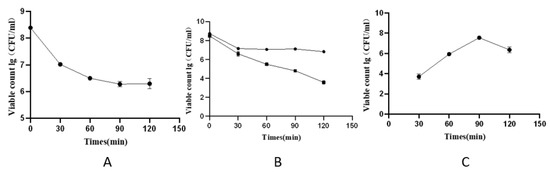 In vitro performance test of microcapsules. (A) Acid resistance test of microcapsules; (B) Bile salt tolerance test of microcapsules: the circular dots were the experimental group, and the square dots were the control group; (C) Enterolysis test of microcapsules.