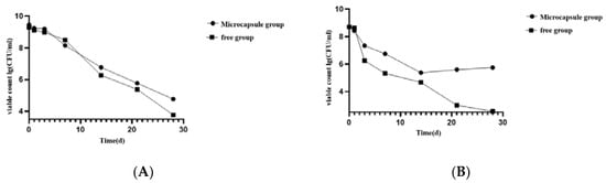 The activity of microencapsulated Lacticaseibacillus casei CGMCC1.8727 was best when preserved at 4 °C (Figure 5), and the number of viable bacteria Lacticaseibacillus casei CGMCC1.8727 was higher than that of the free probiotic solution, indicating that microencapsulated Lacticaseibacillus casei CGMCC1.8727 has good stability and probiotic activity at 4 °C. After 28 days of storage at 4 °C, the number of viable bacteria remained at 5.87 ± 0.15 log CFU/mL.