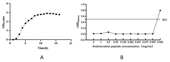Determination of growth curve of Vibrio parahaemolyticus and minimum inhibitory concentration (MIC) test for antimicrobial peptides. (A) Determination of growth curve of Vibrio parahaemolyticus; (B) Minimum inhibitory concentration (MIC) test for antimicrobial peptides.