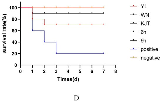 Symptom, lesion and survival curve of rats. (A) External symptoms of rats in the positive group; (B) Severe diarrhea in dead rats; (C) Intestinal lesions after dissection in rats; (D) Survival curve: YL group: naked bacteria group; WN group: microcapsule group; KJT group: antibacterial peptide group; 6 h group: antibacterial peptide + microcapsule interval 6 h group; 9 h group: antibacterial peptide + microcapsule interval 9 h group; positive group: rats in a normal saline group; negative group: the control group (n = 10).