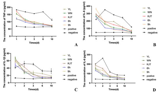 Changes of inflammatory factor concentration in the supernatant of duodenal tissue. (A) The changes of TNF–α; (B) The changes of IL–8; (C) The changes of IL–1β; (D) The changes of IL–6. YL group: naked bacteria group; WN group: microcapsule group; KJT group: antibacterial pep–tide group; 6 h group: antibacterial peptide + microcapsule interval 6 h group; 9 h group: antibacterial peptide + microcapsule interval 9 h group; positive group: rats in a normal saline group; negative group: the control group (n = 3).