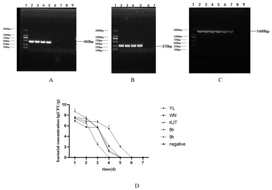 Concentration changes and colony identification of Vibrio parahaemolyticus in feces. (A) 1: DL2000 DNA Marker 2–5: Vibrio parahemolyticus RIMD2210663 tlh virulence gene 6–9: negative control; (B) 1: DL2000 DNA Marker 2–5: vibrio parahemolyticus RIMD2210663 tdh virulence gene 6,7: negative control; (C) 1: DL2000 DNA Marker 2–7: Vibrio parahaemolyticus RIMD2210663 16SrRNA 8,9: negative control; (D) The variation of Vibrio parahaemolyticus RIMD 2,210,663 concentration in feces: YL group: naked bacteria group; WN group: microcapsule group; KJT group: antibacterial peptide group; 6 h group: antibacterial peptide + microcapsule interval 6 h group; 9 h group: antibacterial peptide + microcapsule interval 9 h group; negative group: the control group (n = 3).