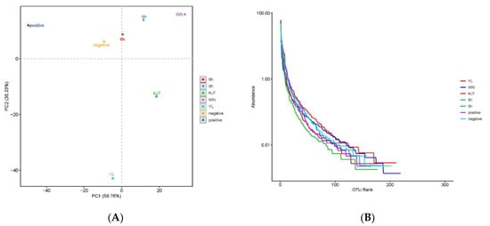 Beta diversity analysis of intestinal microbiota of rats in experimental groups. (A) PCA analysis of intestinal microbiota structure among experimental rats in each group; (B) Rank abundance curve. YL group: naked bacteria group; WN group: microcapsule group; KJT group:antibacterial pep–tide group; 6 h group: antibacterial peptide + microcapsule interval 6 h group; 9 h group: anti–bacterial peptide + microcapsule interval 9 h group; positive group: rats in a normal saline group; negative group: the control group.