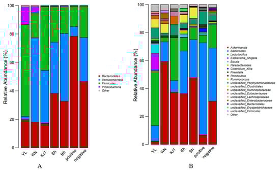 Histogram of relative abundance of fecal flora in each group at phylum and genus level. (A) Colony distribution at the phylum level; (B) Colony distribution at the genus level. YL group: naked bacteria group; WN group: microcapsule group; KJT group: antibacterial pep–tide group; 6 h group: antibacterial peptide + microcapsule interval 6 h group; 9 h group: antibacterial peptide + microcapsule interval 9 h group; positive group: rats in a normal saline group; negative group: the control group.