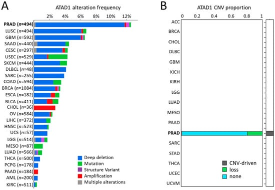 3.2. Deep Deletion of ATAD1 Predominantly Occurs in PRAD