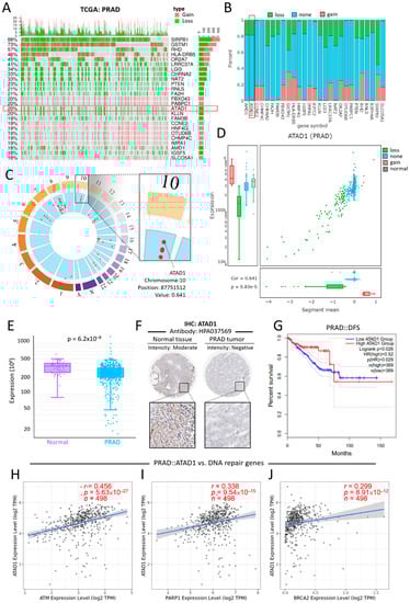 Deletion-associated downregulation of ATAD1 features clinical value on the differential gene expression, prognostic prediction and pathological testing (A) oncoplot illustrates the relations between the top 25 genes and their CNV in patients with PRAD; the samples of cancer patients are on the x-axis and the top 25 genes are on the y-axis. Note that ATAD1 contains only CNV loss and non-alteration; (B) bar chart provides an overview of the CNV percentages for each of the top 25 genes in patients with PRAD; (C) locus enrichment graph shows the loci of all listed genes within all chromosomes. Each red dot represents a gene and its related position on the chromosome. Enlarged square shows the chromosome, position, and value of ATAD1. The value represents the correlation between mRNA expression and CNV; (D) a combination of scatter plot and boxplots shows a detailed view of the CNV distribution and correlation of ATAD1 in PRAD; (E) box plot shows the ATAD1 expression levels in normal tissues and PRAD tumors. (F), Immunohistochemistry staining using antibody HPA037569 for the detection of ATAD1 protein expression levels in normal tissues and PRAD tumors; (G) Kaplan–Meier analysis of the disease-free survival rate based on low/high ATAD1 expression. HR, hazard ratio; and (H–J) Spearman correlation analysis of ATAD1 with DNA repair genes for prostate cancer such as ATM (H) and PARP1 (I) and BRCA2 (J).