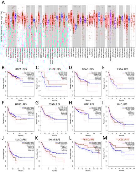 Generalization value of ATAD1 across cancers (A); expression profile of ATAD1. * p < 0.05, ** p < 0.01, *** p < 0.001 between a particular tumor and corresponding normal tissue (B–M); Kaplan–Meier survival analysis representing the probability of disease-free survival (DFS) based on low/high ATAD1 expression in breast cancer (BRCA) (B); cholangiocarcinoma (CHOL) (C); colon adenocarcinoma (COAD) (D); esophageal carcinoma (ESCA) (E); head and neck squamous cell carcinoma (HNSC) (F); stomach adenocarcinoma (STAD) (G); kidney renal papillary cell carcinoma (KIRP) (H); liver hepatocellular carcinoma (LIHC) (I); lung adenocarcinoma (LUAD) (J); skin cutaneous melanoma (SKCM) (K); kidney renal clear cell carcinoma (KIRC) (L); and uterine corpus endometrial carcinoma (UCEC) (M). * p < 0.05 and ** p < 0.01 calculated by log-rank test comparing low ATAD1 and high ATAD1 group.