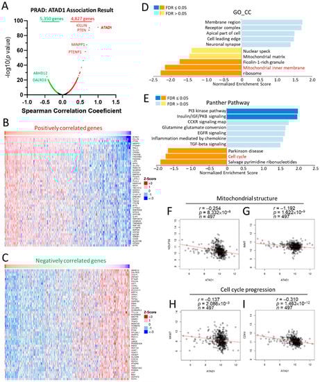Involvement of ATAD1 in mitochondrial structure and cell cycle progression in PRAD. Enrichment analysis of TCGA-PRAD samples was conducted by using the LinkedOmics functional modules. (A), Volcano plot showing the Pearson correlation coefficient and p value of the ATAD1-coexpressed genes; (B,C) heatmap showing top 50 positively (B) and negatively (C) correlated genes with ATAD1; (D,E) bar chart showing the normalized enrichment score, involved gene count and false discovery rate (FDR) of the gene ontology cellular component (GO_CC) terms (D) and Panther pathway terms (E); (F,G) dot pots showing the correlation between ATAD1 and mitochondrial structure genes such as NDUFS6 (F) and IMMT (G); (H,I) dot pots of the correlation between ATAD1 and cell cycle progression genes such as MKI67 (H) and CDK4 (I).