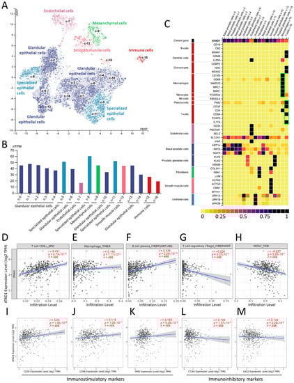 Considering the vital role of TME in tumor growth, spread, and escape from immune-mediated destruction [29,30], we further analyzed the relationship between ATAD1 and tumor-immune interaction. We used single-cell RNA sequencing datasets to analyze the transcriptomic profile and visualize the heterogenous cell populations. The 10× Genomics datasets retrieved from HPA portal was used to explore the potential association of ATAD1 with immune cells in the prostate microenvironment. We acquired gene expression data of 35,862 single cells to construct UMAP plot and bar chart in which the specificity and distribution of ATAD1 in different cell populations in the prostate were analyzed to determine the differential expression at single-cell level (Figure 6A,B). The heatmap demonstrated the expression of ATAD1 and iconic biomarkers of multiple cell clusters in prostate tissue (Figure 6C), whereby we identified specific immune cells (green boxes) such as macrophage, plasma cells and T cells that harbor high expression from the single-cell sequencing data. Accordingly, we further analyzed the correlation of ATAD1 with the infiltrated immune cells. ATAD1 positively correlated with the infiltration level of CD8+ T cell (Figure 6D), macrophage (Figure 6E), and plasma cells (Figure 6F), while negatively correlated with that of regulatory T cells (Tregs) (Figure 6G) and myeloid derived suppressor cells (MDSC) (Figure 6H). Furthermore, we noted that ATAD1 had positive associations with immunostimulatory markers such as CD28 (Figure 6I), CD86 (Figure 6J) and PIM2 (Figure 6K), while showed negative correlations with immunosuppressive markers such as CTLA4 and (Figure 6L) LAG3 (Figure 6M). Taken together, these results suggest that ATAD1 downregulation is associated with an immunosuppressive TIME.