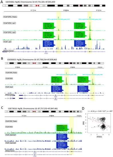 The ChIP-Seq dataset derived from GSE55062, GSE83653 and GSE73616 in which ERG ChIP-seq was performed in human prostate cancer cell line VCaP [22]. The binding of ERG to ATAD1 promote region was analyzed on The University of Alabama at Birmingham CANcer (UALCAN) data analysis portal, which allows users to perform in silico validation of potential genes of interest [23,24].