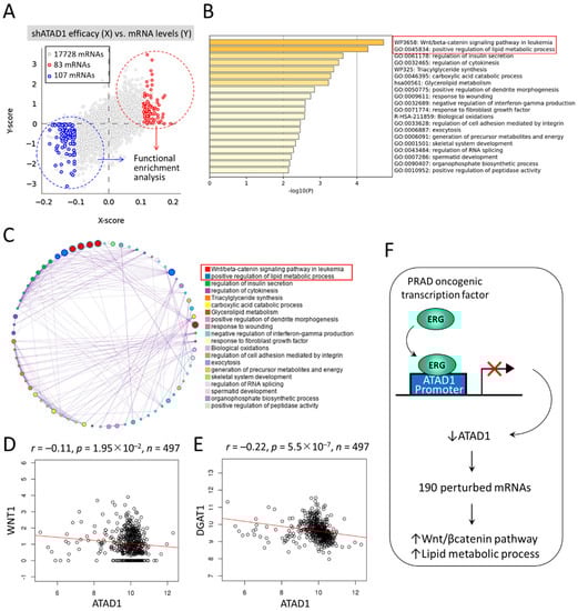 Downstream mechanisms of ATAD1 involved in Wnt/beta-catenin signaling and lipid metabolic process: (A) dot plots showing the cross-association screening between shATAD1 efficacy and altered mRNA levels. X-score represents log(fold-change) of shATAD1 efficacy between samples of high and low expression of target mRNA. Y-score represents log(fold-change) of target mRNA levels between samples of high and low shATAD1 efficacy. Red and blue dots denote significantly upregulated and downregulated mRNAs by shATAD1, respectively. Then the 190 altered mRNAs are subjected to functional enrichment analysis using Metascape portal; (B) bar chart of enriched terms across input mRNAs, colored by p-values. Top two enriched terms (p < 10−4) are highlighted; (C) Network of enriched terms colored by cluster ID, where nodes that share the same cluster ID are typically close to each other; (D,E), dot plot showing the Pearson correlation coefficient of ATAD1 with WNT1 (D) and DGAT1 (E) by retrieving TCGA-PRAD datasets; and (F) a schematic illustrates that oncogenic ERG acts as a transcriptional repressor to reduce ATAD1 expression, which could lead to 190 altered mRNAs and perturbation of Wnt/beta-catenin pathway and lipid metabolic process.