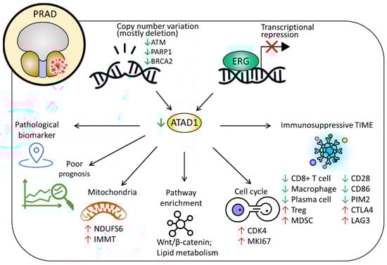 Although the biological function of ATAD1 in mitochondrial proteostasis is emerging, clinicopathological value of ATAD1 in patients with PRAD remains unclear. In this study, we unveiled that decreased ATM, PARP1 and BRCA2 are associated with ATAD1 downregulation in PRAD tissues. In addition, the transcription repression of ERG may also play a role. ATAD1 downregulation could serve as a biomarker for pathology and poor prognosis. The downstream of ATAD1 is involved in the regulation of Wnt/β-catenin pathway and lipid metabolic process. ATAD1 has a negative association with functional markers of mitochondria (NDUFS6 and IMMT) and cell cycle (CDK4 and MKI67). Moreover, reduced ATAD1 correlates with an immunosuppressive TME. A proposed model is summarized in Figure 9.