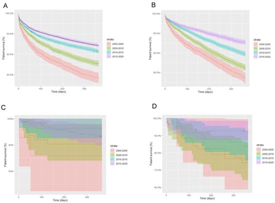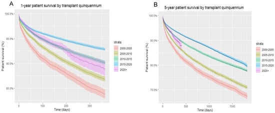 3.4. Effects of Quinquennium and Infection Status on Patient Survival