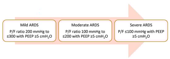 Per Berlin’s definition, acute respiratory distress syndrome (ARDS) is described as new or worsening respiratory distress within one week of a known clinical insult that presents as bilateral opacities on chest imaging that are unexplained by heart failure. It is further characterized into different severities based on abnormalities in the gas exchange based on the PaO2/FiO2 (P/F) ratio, as shown in Figure 1 [1].