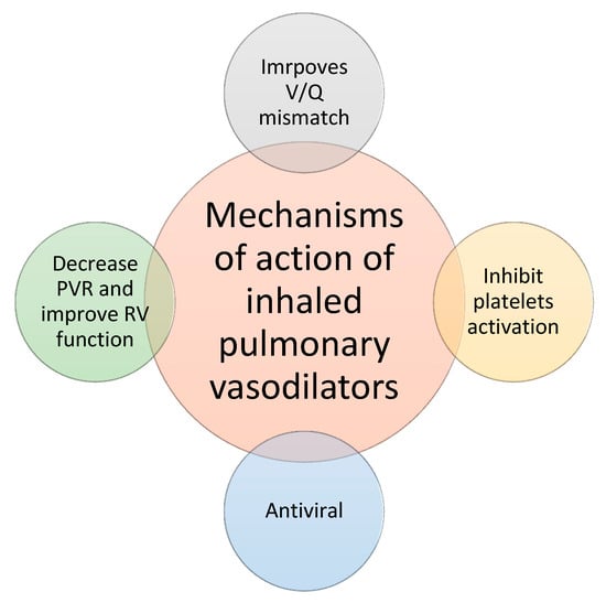 - Khokher, W.; Malhas, S.-E.; Beran, A.; Iftikhar, S.; Burmeister, C.; Mhanna, M.; Srour, O.; Rashid, R.; Kesireddy, N.; Assaly, R. Inhaled Pulmonary Vasodilators in COVID-19 Infection: A Systematic Review and Meta-Analysis. J. Intensive Care Med. 2022, 37, 1370–1382. [Google Scholar] [CrossRef]