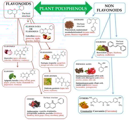 Pictorial representation of different classes and subclasses of polyphenols, including their chemical structures and sources, adapted from Ref. [11].
