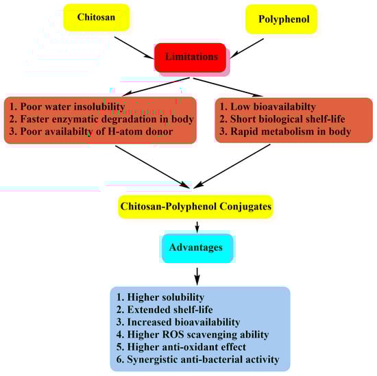 Flow diagram of limitations of chitosan and polyphenol, and advantages of chitosan-polyphenol.