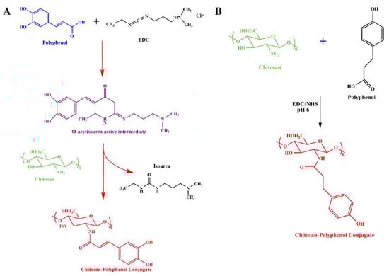 Proposed mechanism for chemical synthesis of polyphenol-chitosan conjugate (A) using only EDC, adapted with permission from Ref. [101], © 2022 The Society for Biotechnology, Japan, Elsevier B.V. (B) using EDC/NHS, adapted with permission from Ref. [102], © 2022 The Royal Society of Chemistry.