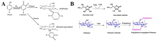 Proposed mechanism for polyphenol-chitosan conjugate through (A) enzyme-mediated strategy, adapted with permission from Ref. [103], © 2022 Elsevier B.V., and (B) free radical induced reaction, adapted from Ref. [93].