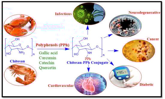 Many of the synthesis strategies to couple chitosan and polyphenol have been intensively investigated, and have been explored from chemical modifications, such as ester modification, enzyme-mediated, and free radical induced processes [86]. Several studies have been performed to evaluate the therapeutic efficiency of chitosan-polyphenol conjugates for various diseases [87,88,89,90,91]. However, not a single review has been made that only concentrates on chitosan-polyphenol conjugates for different disease treatments for human health. In this review, different recently used strategies of chitosan-polyphenol conjugate formation, with their advantages and limitations, have been described. Furthermore, the applicability of the combinatorial efficiency of both chitosan and polyphenol for therapeutic application in human health has been described in detail.