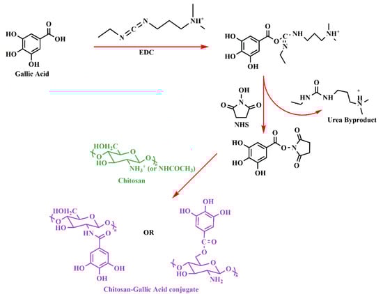 - Pasanphan, W.; Chirachanchai, S. Conjugation of Gallic Acid onto Chitosan: An Approach for Green and Water-Based Antioxidant. Carbohydr. Polym. 2008, 72, 169–177. [Google Scholar] [CrossRef]