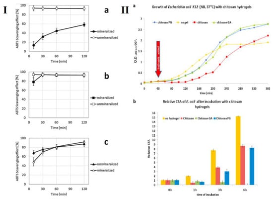 (I) Antioxidant activity of chitosan hydrogels enriched with GA (a), PG (b), and without tannins (c) before and after mineralization. (II) Antibacterial activity of chitosan hydrogels enriched with GA and PG. (a) Growth of E. coli in liquid culture in presence of hydrogels (b) Relative colony-forming ability of E. coli on agar after incubation with hydrogels (CFU counts were normalized to values at time 0 h). Mean values are shown (n = 4). Error bars show standard deviation, adapted with permission from Ref. [112], © 2022 Elsevier Ltd.