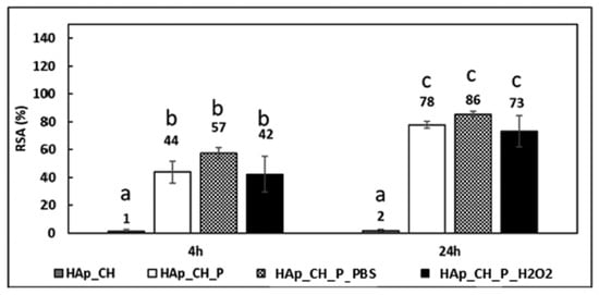 Radical Scavenging Activity obtained with the DPPH test, the values are expressed in percentage, and they were evaluated at 4 and 24 h of soaking in the DPPH solution. The bars that share at least one letter are not significantly different (p < 0.05 calculated with Tukey’s test), adapted with permission from Ref. [88], © 2022 American Chemical Society.