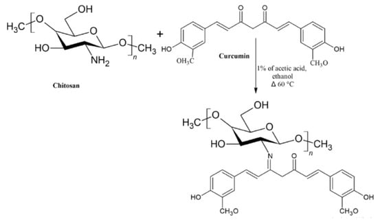 Chemical synthesis of chitosan-curcumin conjugation, adapted with permission from Ref. [122], © 2022 Elsevier Ltd.