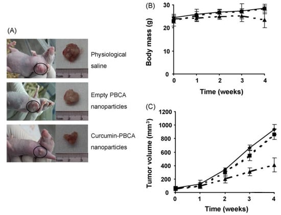 In vivo efficacy of curcumin-PBCA NPs and empty PBCA NPs in HepG2 hepatocellular cancer xenograft. (A) The images of HepG2 xenograft-bearing mice treated with curcumin-PBCA NPs, empty PBCA NPs and control tumor; changes in body weight of animals (B) and tumor volume (C) as a function of time in subcutaneous HepG2 xenograft. Straight line: physiological saline; dashed line: empty PBCA NPs; double dot dashed line: curcumin PBCA NPs, adapted with permission from Ref. [118], © 2022 Elsevier B.V.