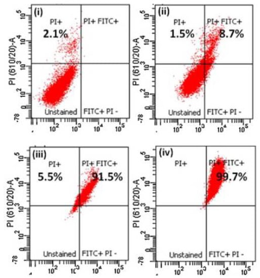 % Apoptosis of SCC25 cells by CUR determined by Annexin V-FITC/PI staining and flow cytometry (i) control cells, (ii) CUR, (iii) CUR-CS, (iv) CUR-CD-CS, adapted with permission from Ref. [120], © 2022 Elsevier B.V.