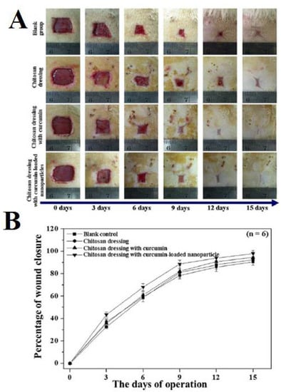 (A) Representative photographs of wounds following full thickness skin excision at 3, 6, 9, 12, and 15 days after surgery; (B) Percentage wound closure is presented at the indicated time points, adapted with permission from Ref. [121], © 2022 Wiley Periodicals, Inc. J Biomed Mater Res Part B: Appl Biomater.