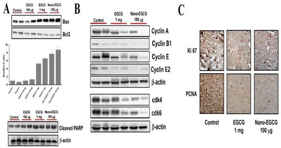 Comparative effects of nonencapsulated EGCG and nano-EGCG on markers of apoptosis, cell cycle, and Proliferation markers in tumors isolated from nude mice. (A) Protein expression of Bax, Bcl2, and the Bax/Bcl2 ratio and PARP. (B) Protein expression of Cyclins A, B1, E, E2, CDK 4, and CDK6. The cells were treated with each agent and harvested 24 h after treatment. Equal loading was confirmed by stripping the membrane and reprobing it with β-actin. Each experiment was repeated twice with similar results. (C) Effect of the treatments on expression of Ki-67 and PCNA in tumor tissues isolated from athymic nude mice. Tumor sections were stained using specific antibodies as detailed in Materials and Methods. Counterstaining was performed with hematoxylin. Scale bar, 50 μm. Photomicrographs (magnification, 20×) show representative pictures from two independent samples, adapted with permission from Ref. [128], © 2022 Elsevier Inc.