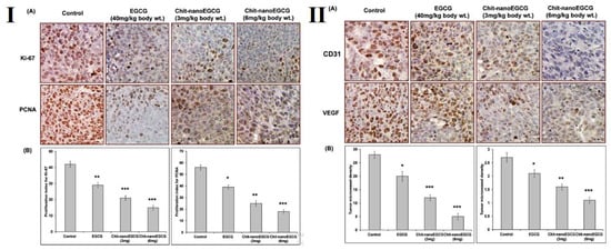 (I) (A) Effect of Chit-nanoEGCG on expression of Ki-67 and PCNA in tumor tissues of athymic nude mice. Tumor sections from athymic nude mice were stained using specific antibodies as detailed in Materials and Methods. Counterstaining was performed with hematoxylin. Scale bar, 50 μm. Photomicrographs (magnification, ×20) show representative pictures from two independent samples. (B) Proliferation index for Ki-67 (left panel) and PCNA (right panel) is shown. * p < 0.05 and ** p < 0.01 and *** p < 0.001, versus control group. (II) (A) Effect of Chit-nanoEGCG on expression of CD31 and VEGF in tumor tissues of athymic nude mice. Tumor sections from athymic nude mice were stained using specific antibodies as detailed in Materials and Methods. Counterstaining was performed with hematoxylin. Scale bar, 50 μm. Photomicrographs (magnification, 20×) show representative pictures from two independent samples. (B) Tumor microvessel density (left panel) and VEGF immunoreactivity score (right panel) was scored as 0+ (no staining), 1+ (weak staining), 2+ (moderate staining), 3+ (strong staining), and 4+ (very strong staining). * p < 0.05 and ** p < 0.01 and *** p < 0.001, versus control group, adapted with permission from Ref. [130], © 2022 Oxford University Press.