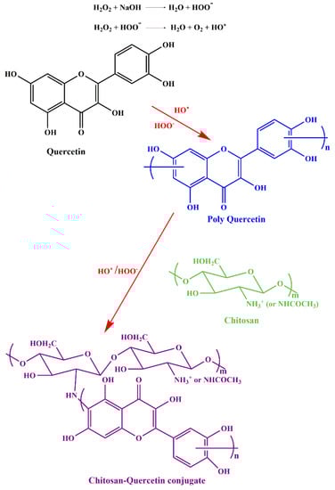 Synthesis of chitosan-quercetin conjugate by free radical strategy, adapted with permission from Ref. [94], © 2022 WILEY-VCH Verlag GmbH & Co. KGaA, Weinheim.