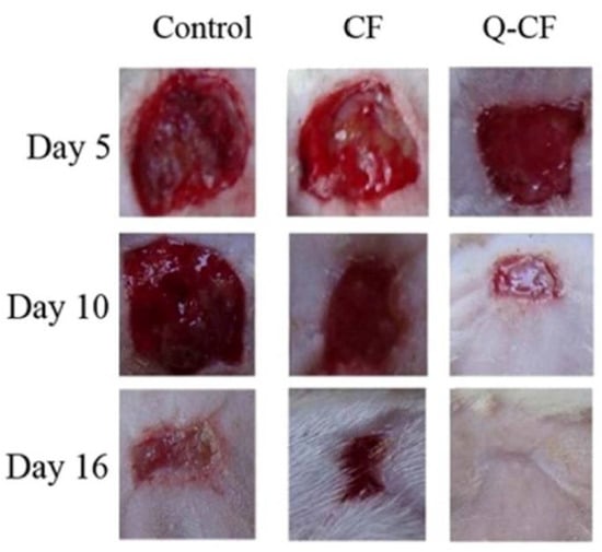 Photographic evaluation of wound closure on different days of healing in control and CF and Q-CF treated rats, adapted with permission from Ref. [134], © 2022 Elsevier B.V.