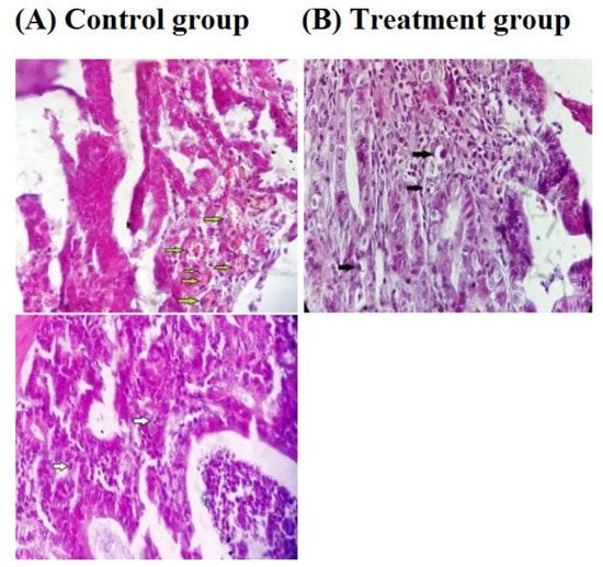 Histological sections of adenocarcinomas from Wistar rat colon. Paraffin embedded sections were stained with H&E. (A) Cancerous control group, (B) Treatment group; cancerous rats were administered by Qu loaded CS NPs through enema. The black arrows indicate apoptotic bodies and the white and green arrows indicate mitotic cells and microvasculars, respectively (400×) Adapted from Ref. [137].