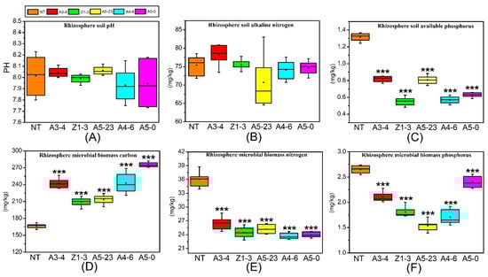 Fumigation with chloroform was used to obtain the microbial biomass of nitrogen (MBN), microbial biomass of carbon (MBC), and microbial biomass of phosphorus (MBP) from the soil in the rhizosphere [12,27,28,29]. The rhizosphere soil samples treated with chloroform fumigation and non-chloroform fumigation were extracted with K2SO4 solution. The rhizosphere MBC, MBN, and MBP were measured using a Vario TOC cube analyzer (Elementar, Langenselbold, Germany). Briefly, fresh rhizosphere soil samples were dissolved in chloroform and the mixtures were boiled for 5 min in a vacuum. Then, 0.5 mol/L K2SO4 was added to the mixtures and subjected to fumigation in the dark at 25 °C for 24 h. The resulting mixture was then filtered with a quantitative filter paper. Simultaneously, the control groups were performed similarly, except that the rhizosphere soil samples were added to the reaction mixture for detection.