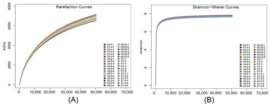 To construct alpha rarefaction curves and evaluate the putative differences in the alpha diversity, the mothur was applied to perform ASV rarefaction analysis based on ASV clustering results. The sample rarefaction curves of rhizosphere bacteria illustrated that most NT and CM varieties saturate around 6500–7000 ASVs, suggesting slight differences in the diversity of the rhizosphere bacterial community between NT and CM varieties (Figure 2A). The Shannon–Wiener curves were also constructed to evaluate the rhizosphere bacterial diversity. The results showed that the Shannon curves are flat when the number of reads reaches 10,000, illustrating that the amount of sequencing data is sufficient to reflect the vast majority of rhizosphere bacterial information in the 36 samples. In addition, Shannon curves of the 36 samples fitted together (Figure 2B) suggested that rhizosphere bacterial communities in different sequencing depths share similar diversity.