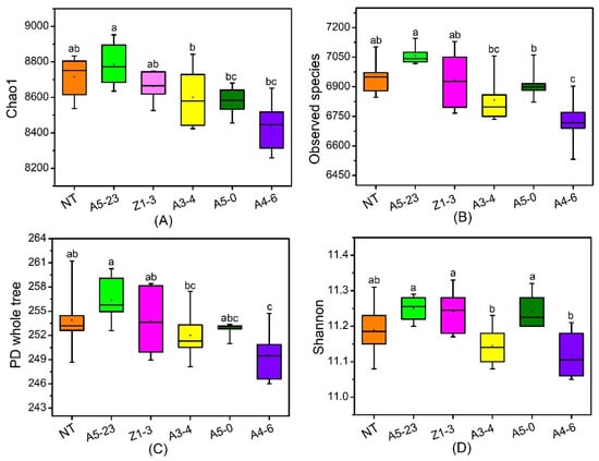 The analysis of the taxonomic distinctiveness of rhizosphere bacteria has been presented based on the alpha diversity as (A) the Chao1 index, (B) the observed species index, (C) the phylogenetic diversity (PD) whole-tree index, and (D) the Shannon index. Data were analyzed using one-way ANOVA and Tukey’s post hoc comparison. Significant differences (p < 0.05) are indicated in lowercase letters. The NT, A5-23, Z1-3, A3-4, A5-0, and A4-6 lines were represented by orange, green, fusica, yellow, juniper, and violet rectangles, respectively.