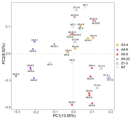 Principal component analysis (PCA) of rhizosphere bacterial communities at the ASVs level. ASVs were defined at a 97% sequence similarity cut-off in mothur. The differences and distances among NT, A5-0, A4-6, Z1-3, A5-23, and A3-4 can be visualized based on an analysis of ASVs’ composition.